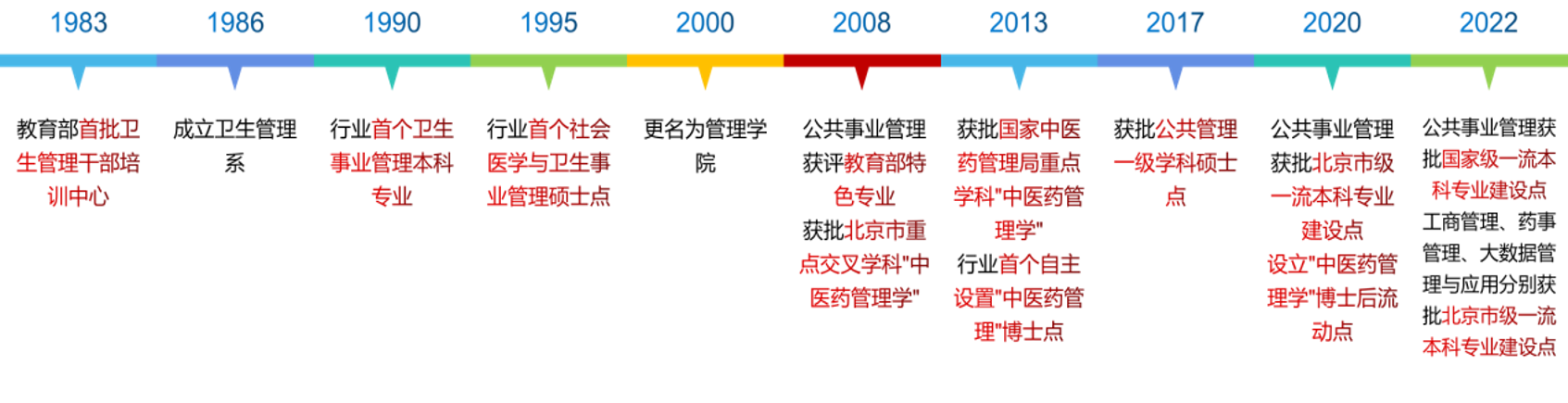 随着时代发展,在国家教育部、原国家卫生部、国家中医药管理局、北京市教委等部门的大力支持下,1985~2000年期间,管理学院进入快速发展阶段。1985年开始招收卫生事业管理专业专科生,1987年12月成立卫生管理系。1990年开始招收卫生事业管理专业本科生,1995年设立中医药院校首个卫生管理类硕士点(社会医学与卫生事业管理),1996年更名为管理系,2000年正式更名为管理学院。