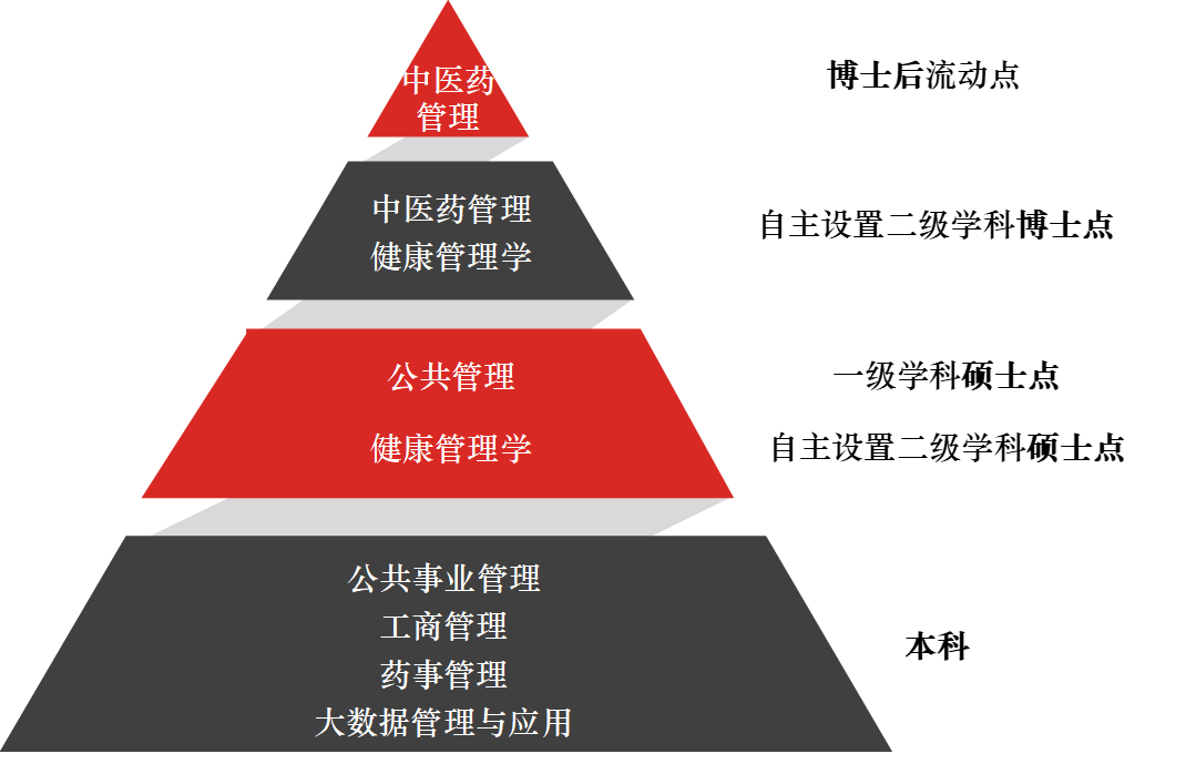 为适应行业发展对人才的需求,2015年开始招收信息管理与信息系统专业本科生。2017年开始招收药事管理专业本科生。2017年获批“公共管理”一级学科硕士点。 2019年开始招收行业内首个大数据管理与应用本科专业。公共事业管理2020年获批北京市本科一流专业,2022年获批国家级一流本科专业建设点。