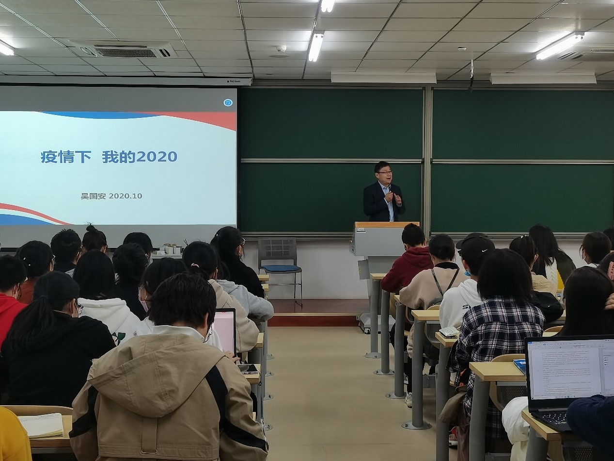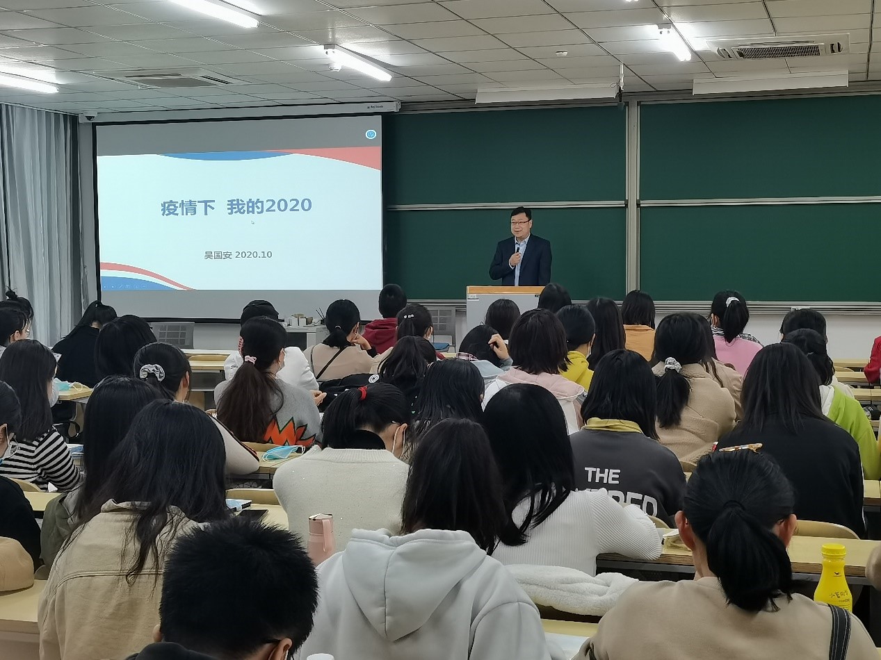 10月22日下午,北京地坛医院原副院长,北京积水潭医院党委副书记、纪委副书记吴国安老师在管理学院为新生做了新生导读。吴老师以高昂的激情,恳切的话语为同学们生做了一次别开生面的讲座,生动地介绍了地坛医院在今年抗“疫”过程中的巨大贡献,以及自己的切身感受。同时勉励大家勤学上进,报效祖国。讲座内容详实、情感丰沛,同学们收获良多。