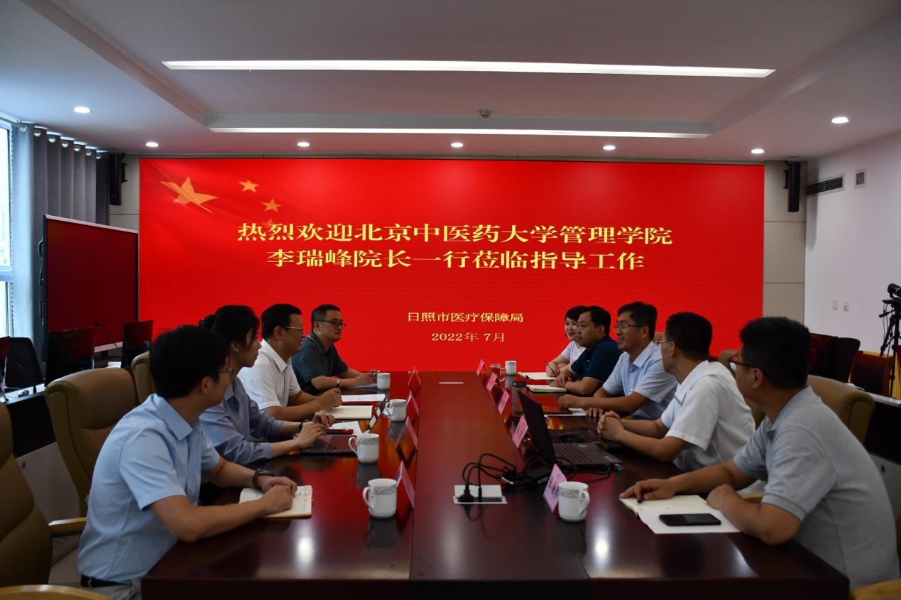 2022年7月29日下午,管理学院院长李瑞锋教授、卫生财经与卫生政策教研室主任石学峰副教授以及孔国书博士一行赴山东省日照市医保局调研并开展科研基地合作洽谈。日照市副市长林彦芹、日照市医保局局长安丰堂、副局长宋震、医药服务管理科科长韩伟,泰康养老保险公司数据产品部总经理李佳、山东分公司健康保险市场部总经理张海参、日照区域中心总经理张伟武出席座谈会。