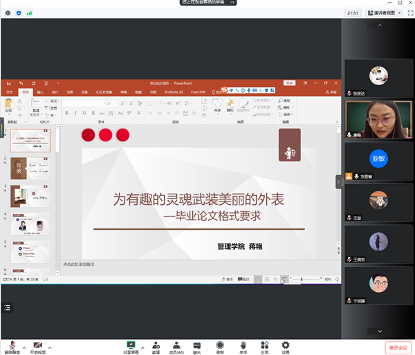 2022年11月4日下午,中国·开云顺利开展了研究生毕业论文撰写专题培训会。此次讲座采用腾讯会议的形式进行,邀请管理学院蒋艳副教授向2023硕士毕业生们讲解研究生毕业论文撰写的注意事项,学院研究生办刘亚敏老师介绍有关研究生毕业论文形式审查要求和管理流程。会议由管理学院副院长王慧主持,管理学院2020级研究生参加。