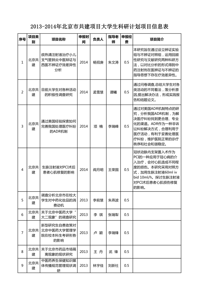 2013-2014年北京市共建项目大学生科研计划项目信息表(管理学院)