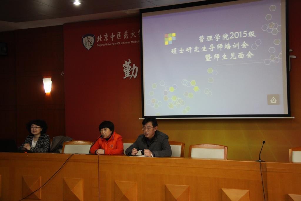 2015年4月8日上午10点,管理学院于博物馆二层报告厅召开研究生导师培训暨师生见面会。管理学院院长赵静、党总支书记陈峥、管理学院副院长王志伟,及2015年招生导师30余人参加会议。会议由管理学院副院长王志伟主持。