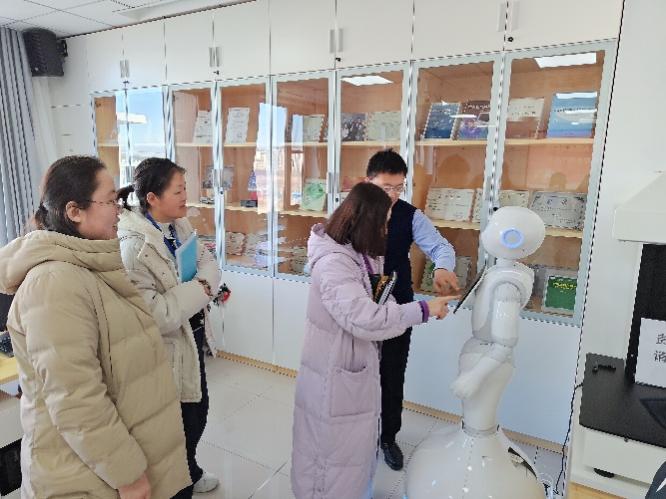 在活动第一环节,医疗大数据与信息管理党支部书记韩爱庆带领大家参观了实验室文化墙,观看了主题为“中医AI人才培养和健康医疗人工智能实验室建设及应用”的微视频和主题为“课比天大”的刘仁权教授教书育人微视频。随后体验了机器人“小管”同学的各项技能,其中,机器人关于二十大精神相关主题内容的出色互动问答能力令老师们印象深刻。期间,韩老师对机器人的各项基本功能和机器人问答基本技术原理做了详细介绍,并介绍了正在展示的刘仁权教授教书育人成果,及大数据专业学生参与研发的智能四诊仪设备,充分体现医疗大数据党支部“数智领航,潜心育人”的支部特色。