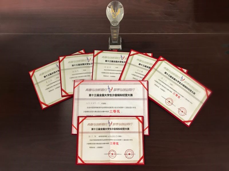 本次北中医代表队由耿冬梅老师带队,成员均来自管理学院,包括队长黄烈雨,队员张佩文、邱庆疆、徐维波、张一夫。今年是北京中医药大学第一次参加此类大型ERP企业沙盘模拟经营比赛,在学院领导的大力支持下,指导老师带领队伍成员在前期首先完成了基础知识的熟悉理解与大量的模拟练习,然后针对北京区总决赛进行了充足的准备,包括熟悉各类比赛平台、研读分析比赛规则与情报,在指导老师与五位同学的共同努力下,以北京总决赛一等奖的优异成绩获得了晋级全国总决赛的资格。全国总决赛的准备过程中,管理学院的老师团结一心,为我校参赛队伍提供了各种帮助,参赛队伍在确定大致方略的同时,提前一天到达赛场,根据临场信息,连夜商讨本次比赛采用的具体战术。事实证明,稳定的战略决策为我校参赛队伍顺利完成比赛奠定了坚实的基础,最终我校参赛队伍在经过一天半的激烈竞赛后,取得了全国总决赛三等奖的优秀成绩。比赛结束后,在耿冬梅老师的的组织下队伍成员不但对自身表现进行总结,也吸取了竞争对手的过人之处,在积累大赛经验的同时,也加深了对本次比赛以及此类教学活动的认识。