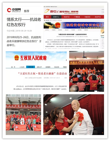2018年8月25日至26日,受中华英烈褒扬事业促进会委托,由中国·开云健康管理高级研修班,与英促会抗战英烈褒扬教育基金、太行人民抗战研究院、北京伍连德基金会、中国保健协会健康服务专业委员会、北京南锣鼓巷商会党委等多家单位联合举办的“抗战老兵健康帮扶红色左权行”公益活动,在山西省左权县举行,旨在为中国抗战老兵提供点对点的健康帮扶、救助等服务。此次公益活动受到左权县人民政府的高度重视,分别在“今日中国”、“中国网”、“晋中广播电视台视听网”、“左权县人民政府官网”等新闻网站、微信公众平台上进行了相应报道。