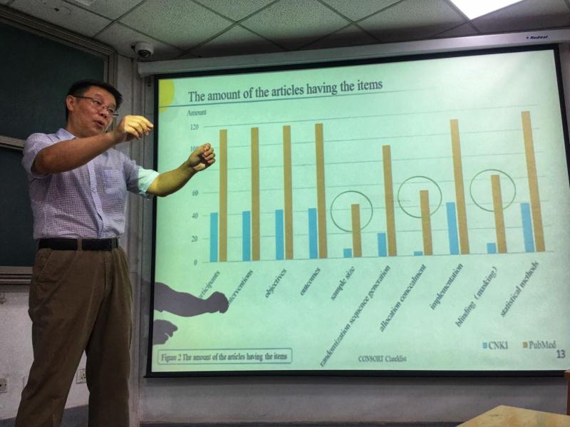 在长达三个小时的讲座中,卞鹰教授用幽默的语言,生动的演讲,展示了其研究团队中一项关于中医药临床试验设计方法的质量评价研究的具体研究过程,从选题设计,指标选取到研究结果进行了详细的介绍,并对国际标准下中医药临床试验设计存在的问题进行了深入剖析。卞教授以本研究为例,对此类系统综述研究的发展历程、最新进展、优势与不足进行了详细解读。同时,卞教授还介绍了许多看似冷僻但妙趣横生的知识帮助同学们理解研究的背景,结合个人其他相关的研究经历,穿插正反面案例,深入浅出进行讲解,引发了同学们的积极讨论和深入思考。