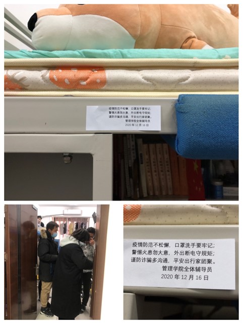 2021年寒假将至,为严防宿舍火患的发生,确保学生人身安全、财产安全,维护校园安全与稳定。2020年12月16日,管理学院党委副书记赵静老师、学办辅导员张瑶萱老师、关键老师、周磊老师对管理学院良乡校区东院学生宿舍进行了逐一检查。