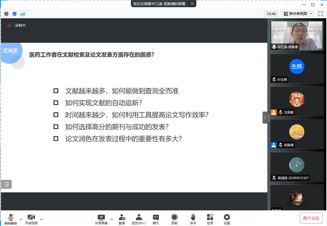 随后,辛副总裁针对医药工作者在文献检索及论文发表方面存在的诸多困惑,结合实例,对相关文献的检索策略进行剖析,详细介绍了如何利用《医学文献王》、《e研通》等工具实现科研效率的提升,包括医学文献的检索,文献的管理,论文写作,论文翻译及润色,以及期刊选择、科研病例数据的智能管理等经验技巧。